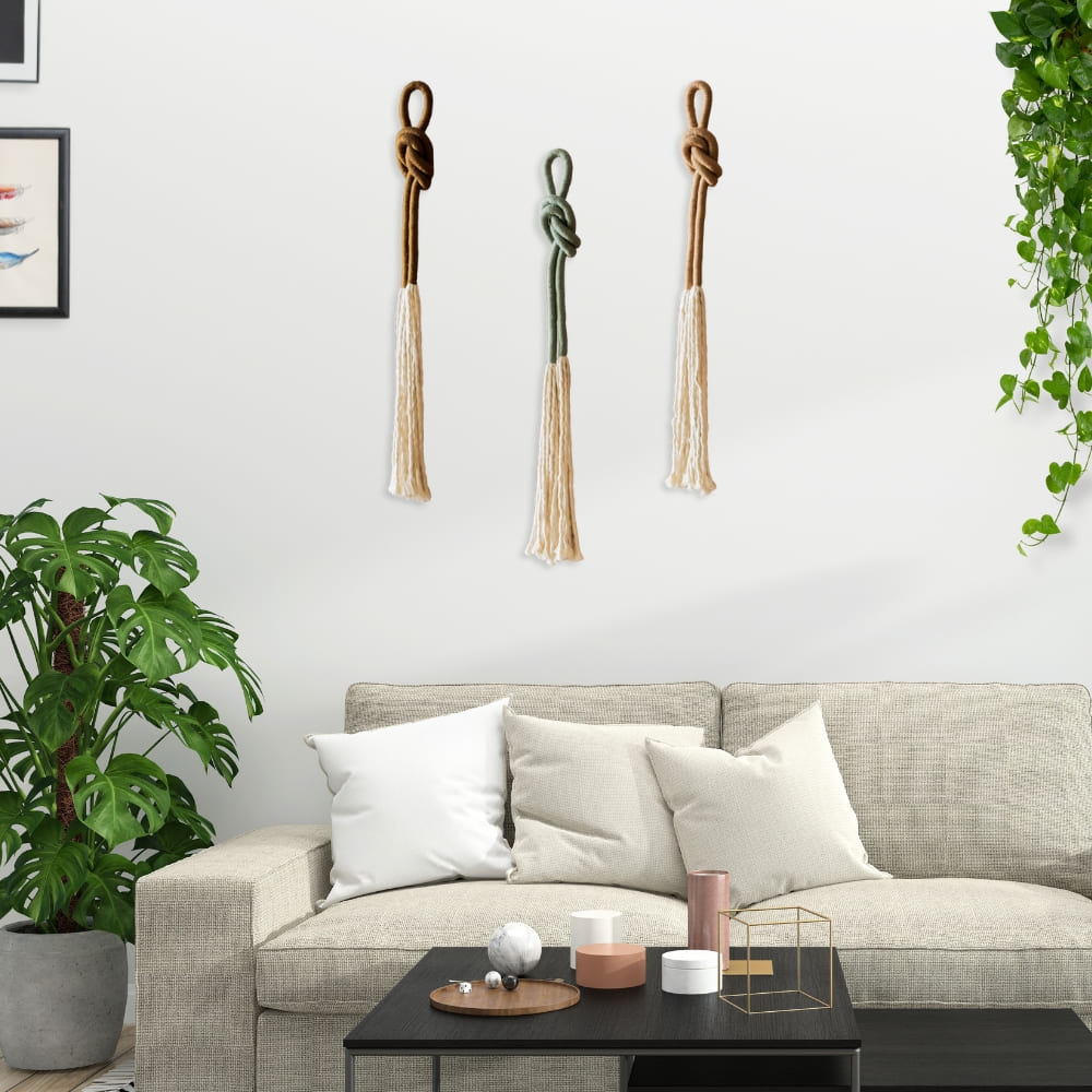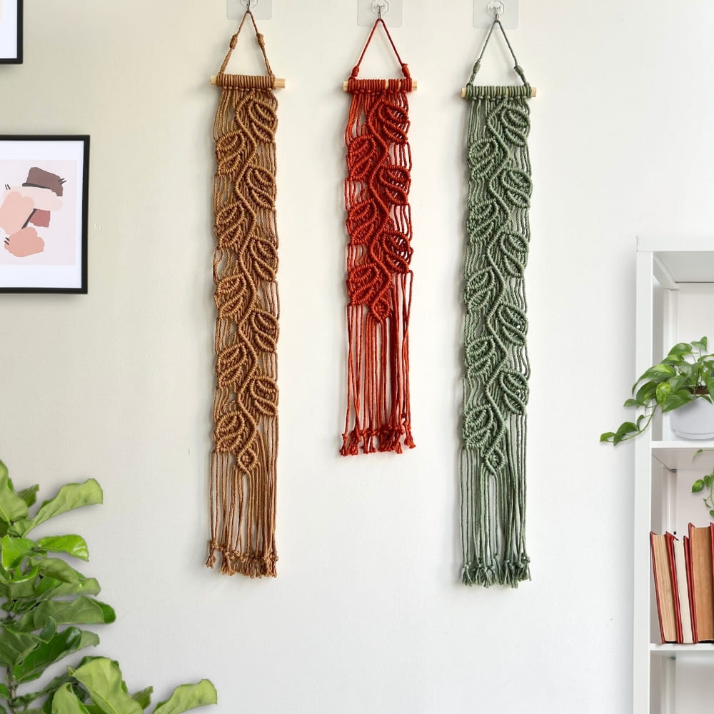 Macrame Long Yarn Leaf Wall Hanging, Minimal Vertical Narrow Art, Botanical Wall Decor, Vertical Vines Wall Art, Housewarming Gift For Mom