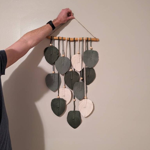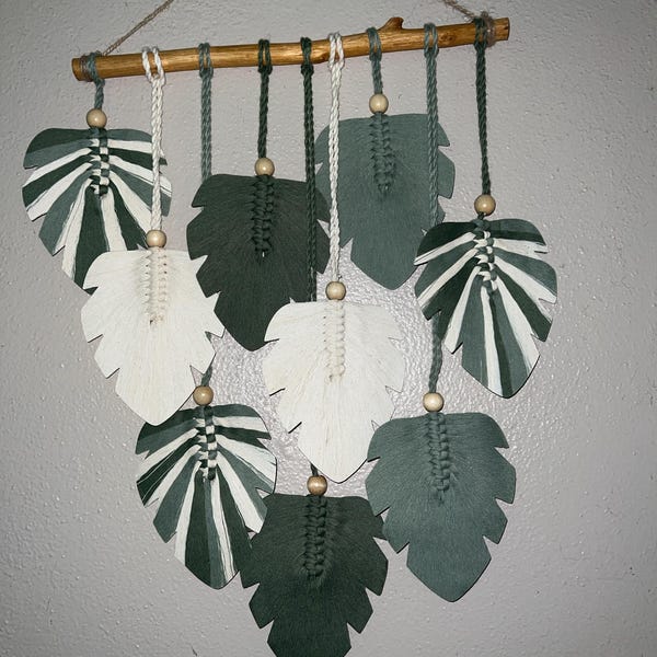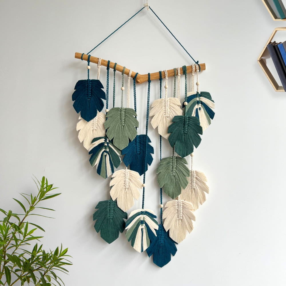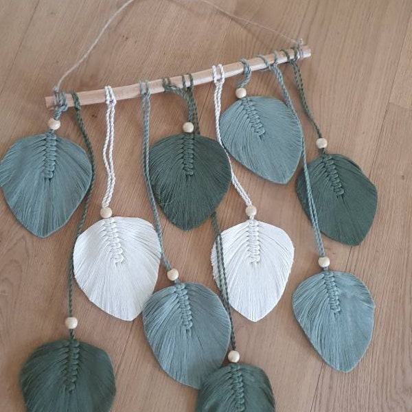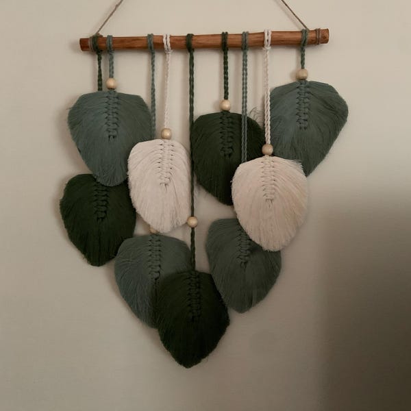Immerse yourself in the charm of handcrafted Macrame Leaves Wall Art, adorned with rich green shades. This modern macrame creation, featuring delicate feather-like leaves, beautifully combines boho and Scandinavian styles. It’s more than just a stunning piece of wall decorβit’s also an ideal housewarming or Christmas gift. Add a touch of botanical elegance to any space with this eye-catching design!